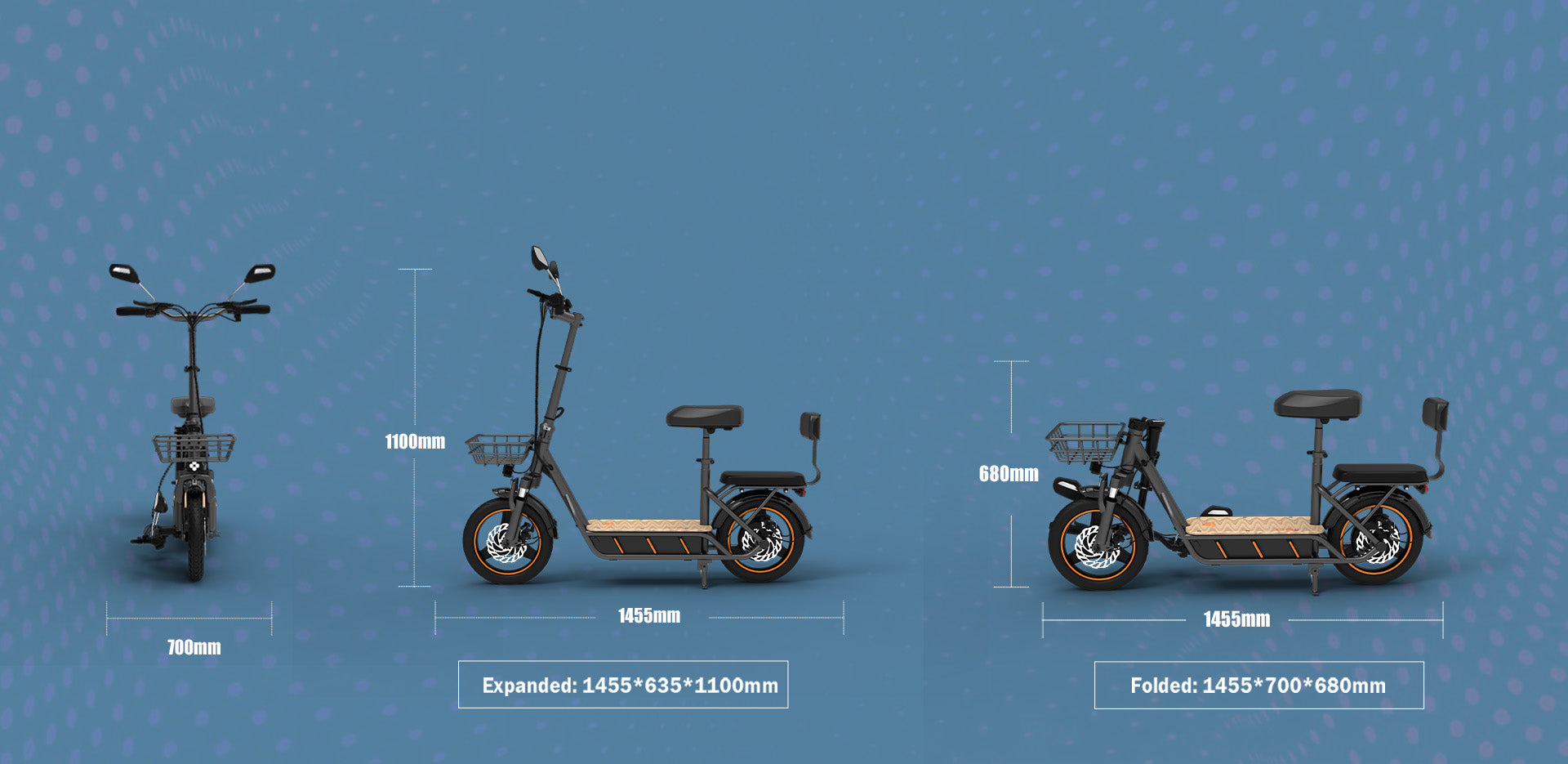 A - Pince de réglage hauteur B - Pince de pliage C - Pneu 14 pouces